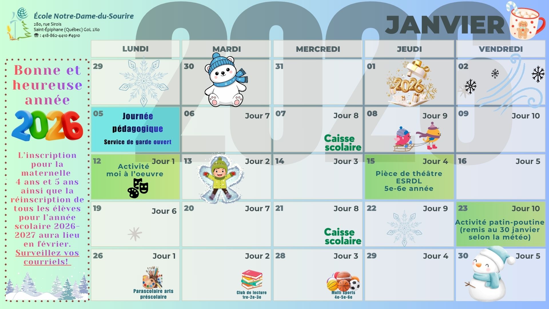 Voici, sous forme de calendrier du mois, un résumé de ce qui se passe à l'École Notre-Dame-du-Sourire.